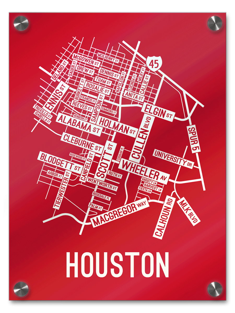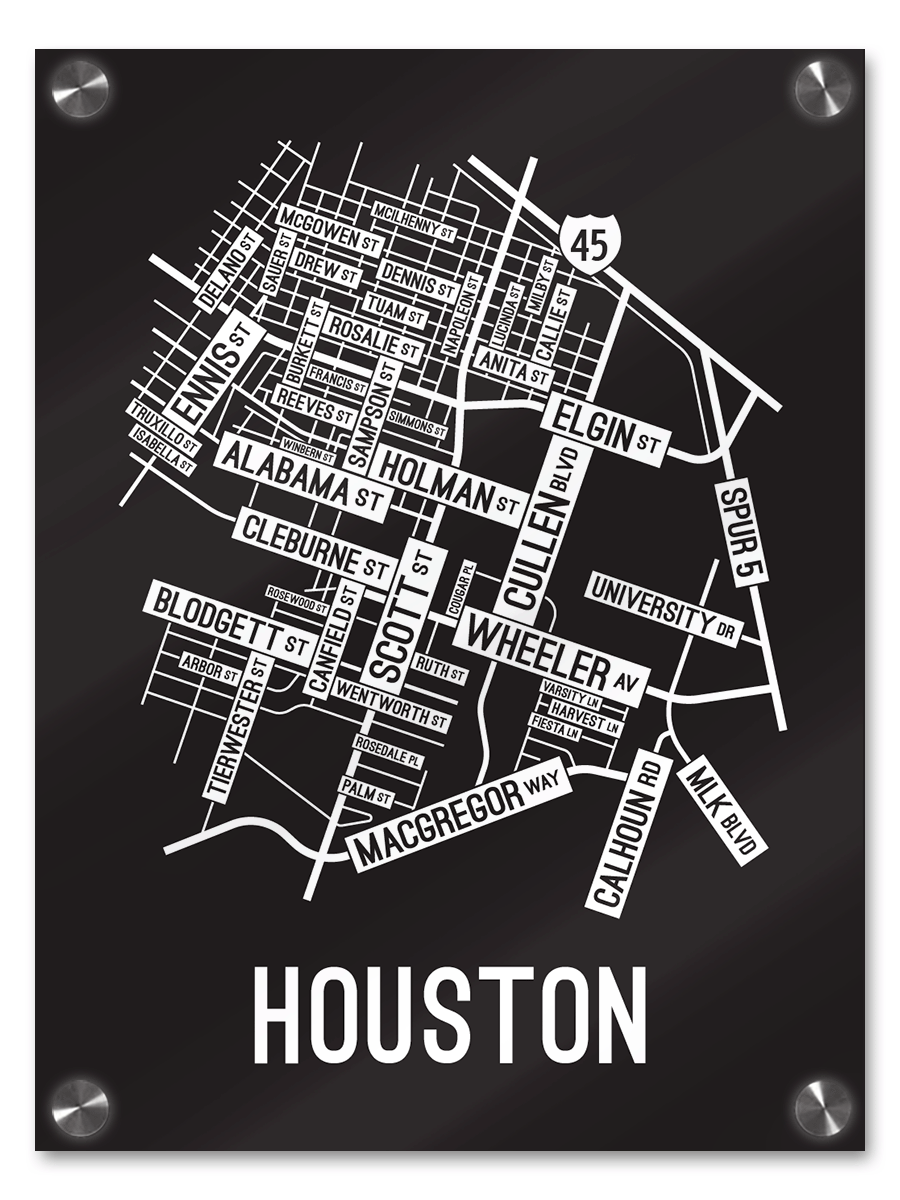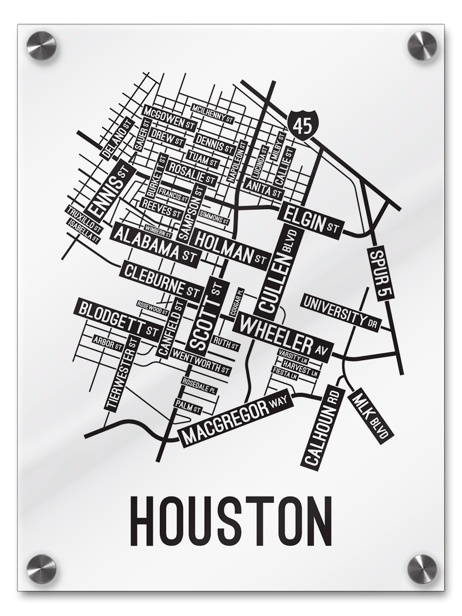 Printed on 1/4” thick cast acrylic and anchored to the wall with four stainless steel standoffs for secure and stylish wall hanging.