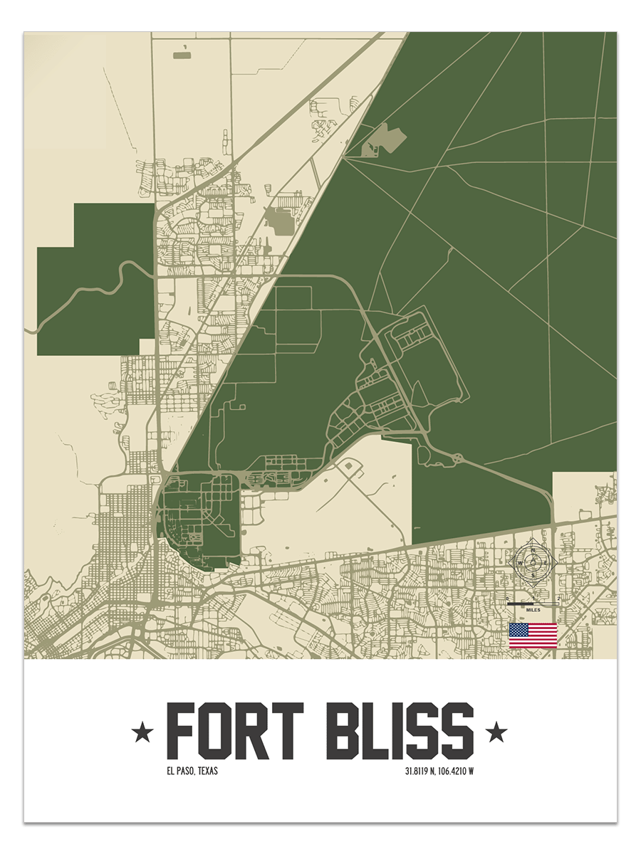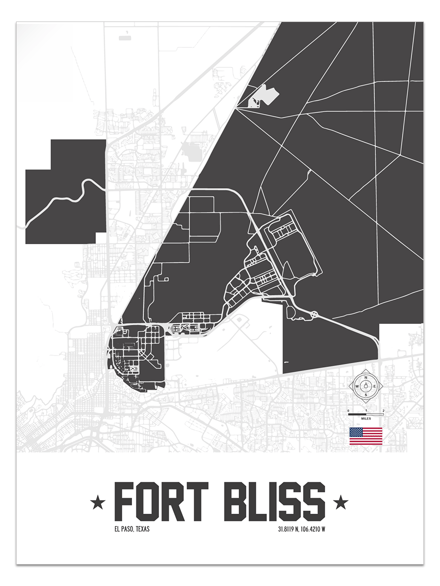 Our map of Fort Bliss in El Paso, Texas is a tribute to the families and those who serve in the United States military.