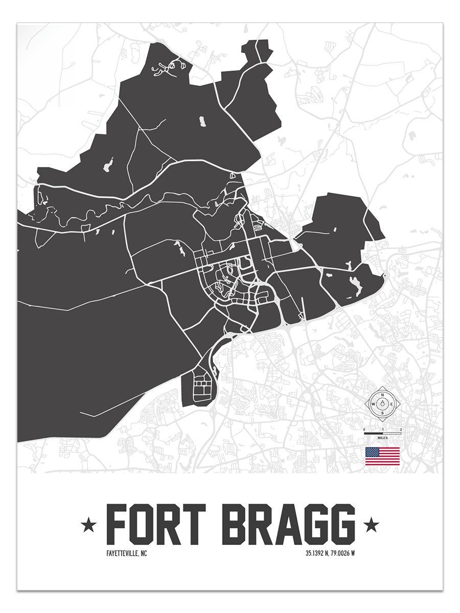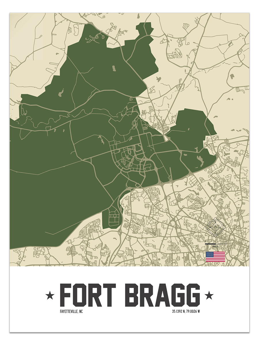 Our map of Fort Bragg in Fayetteville, North Carolina is a tribute to the dedicated families and soldiers who serve in the United States military.