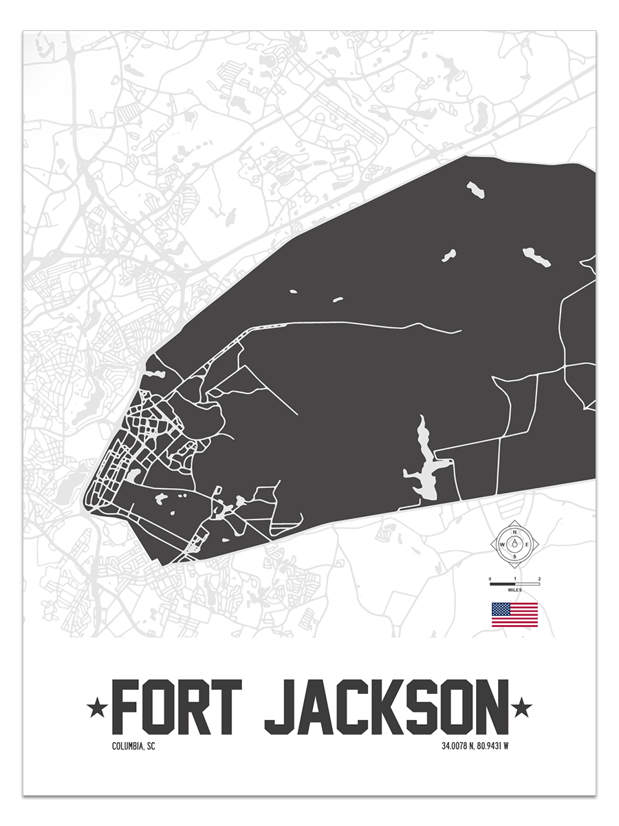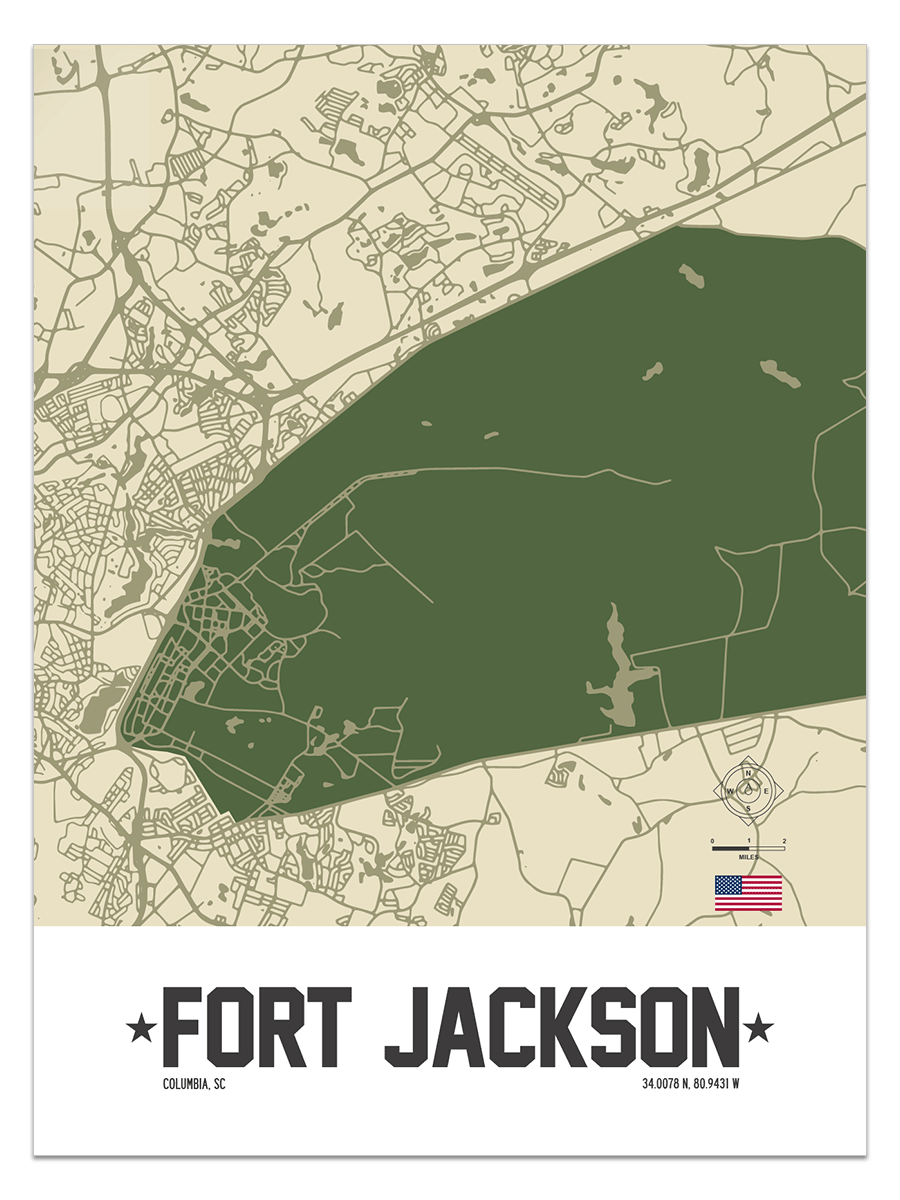 Our map of Fort Jackson in Columbia, South Carolina is a tribute to the dedicated families and soldiers who serve in the United States military.