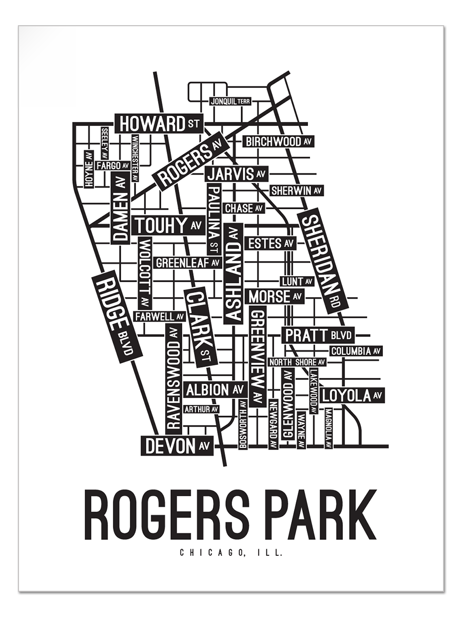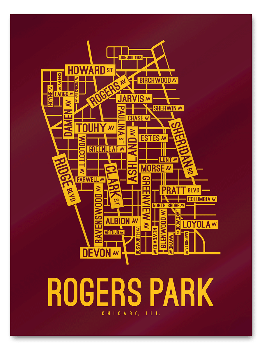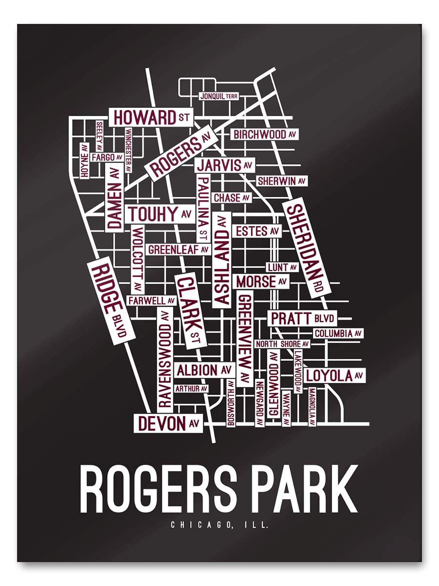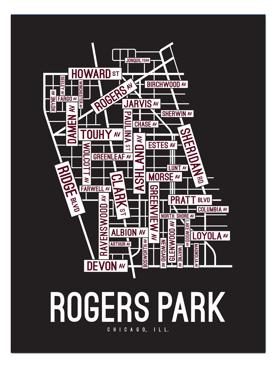 Our Rogers Park, Chicago street map honors Chicago's north side and the streets and avenues around the Red Line's Granville and Loyola stations.