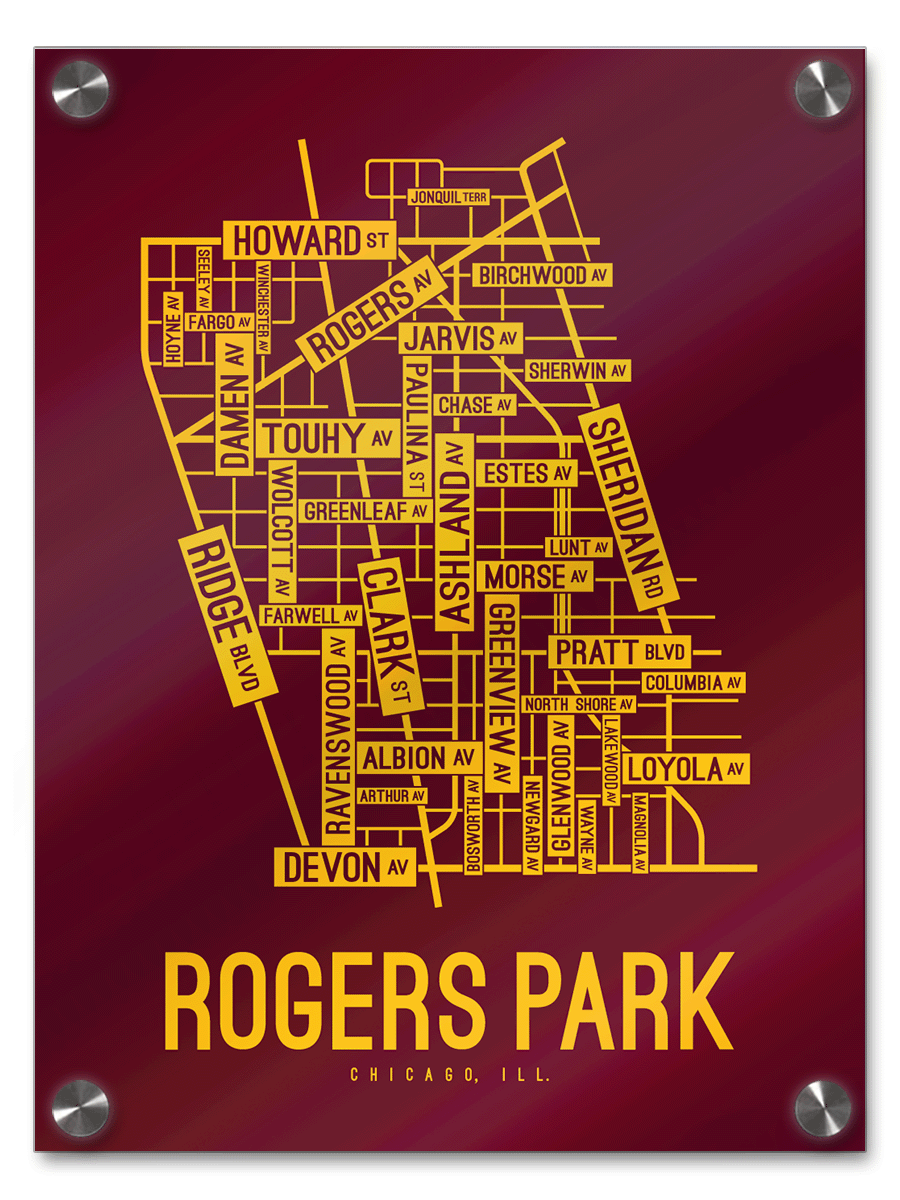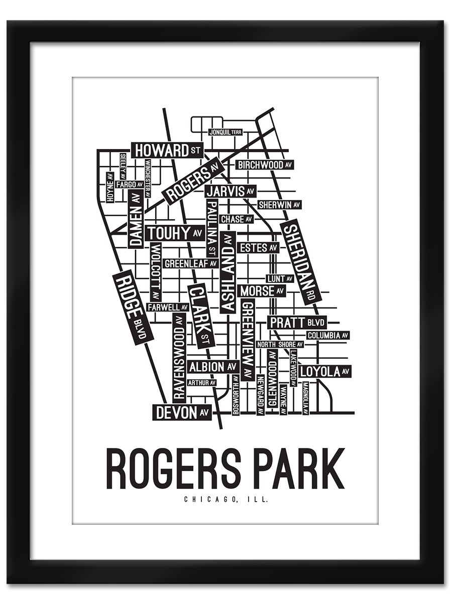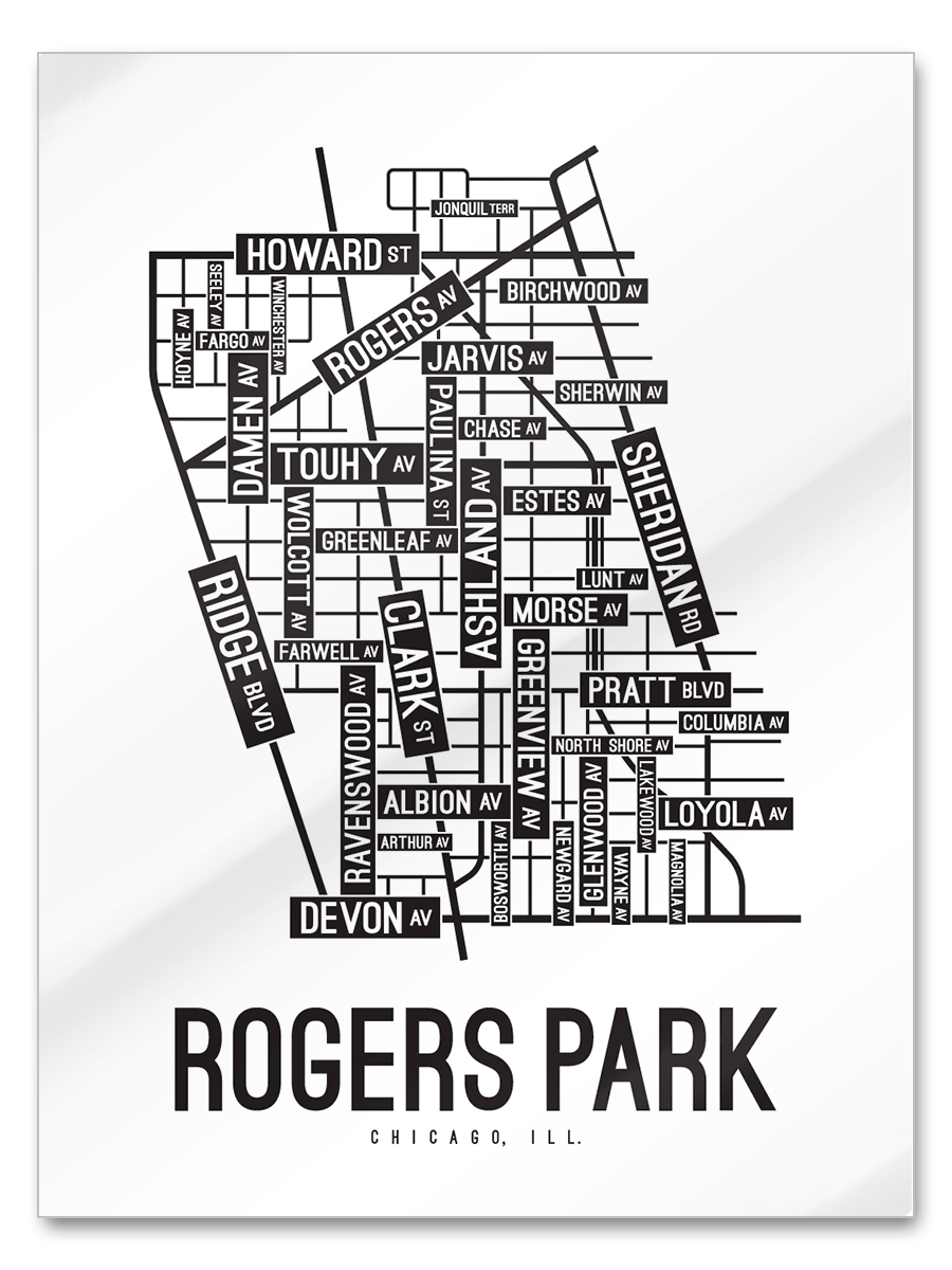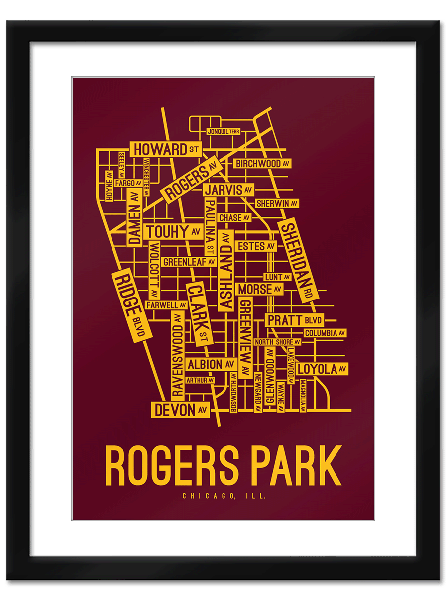 Our Rogers Park, Chicago street map honors Chicago's north side and the streets and avenues around the Red Line's Granville and Loyola stations.