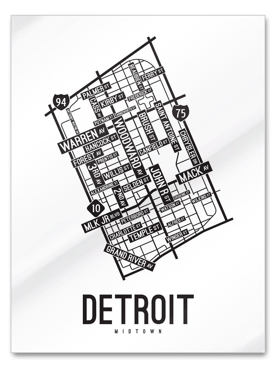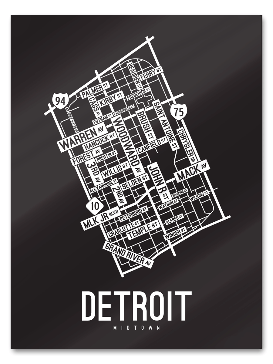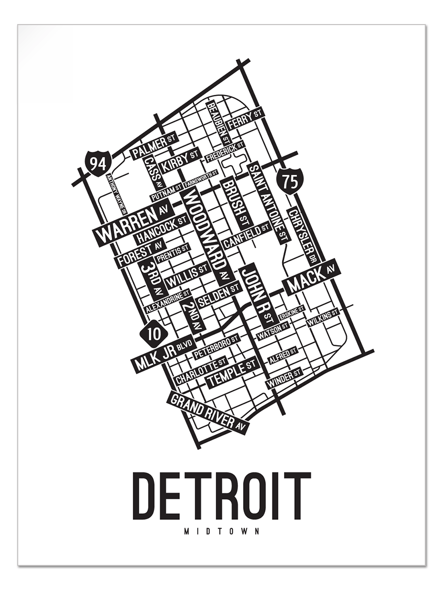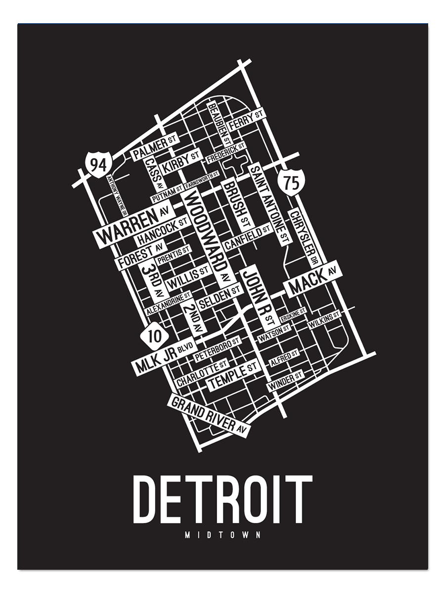 Our map of Detroit's midtown neighborhood features the streets and avenues around Woodward, Warren, Cass, and Kirby.