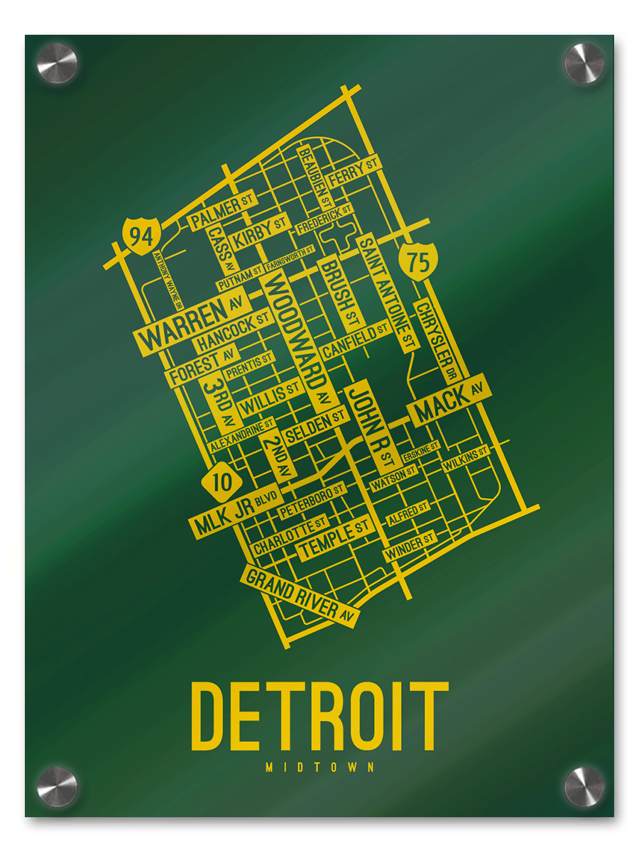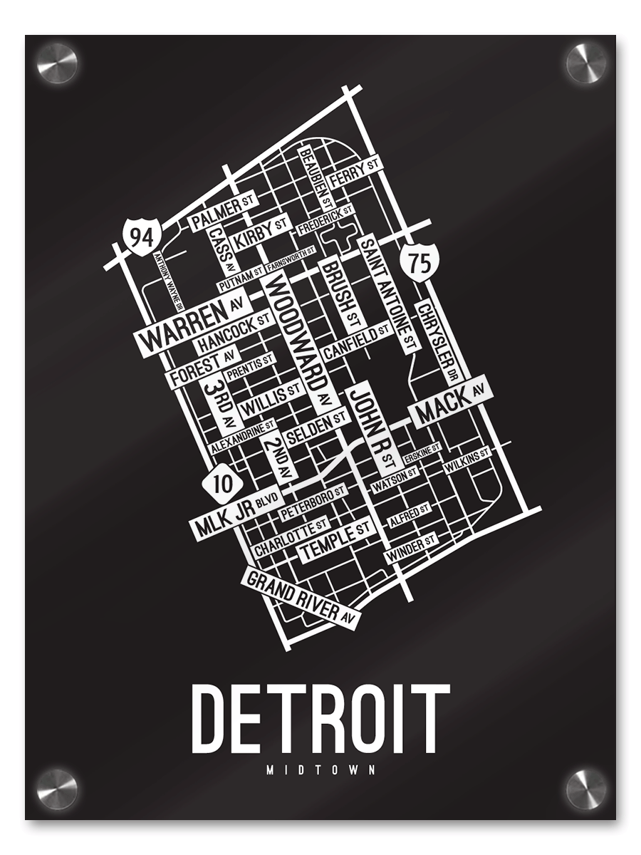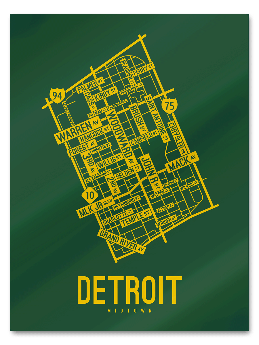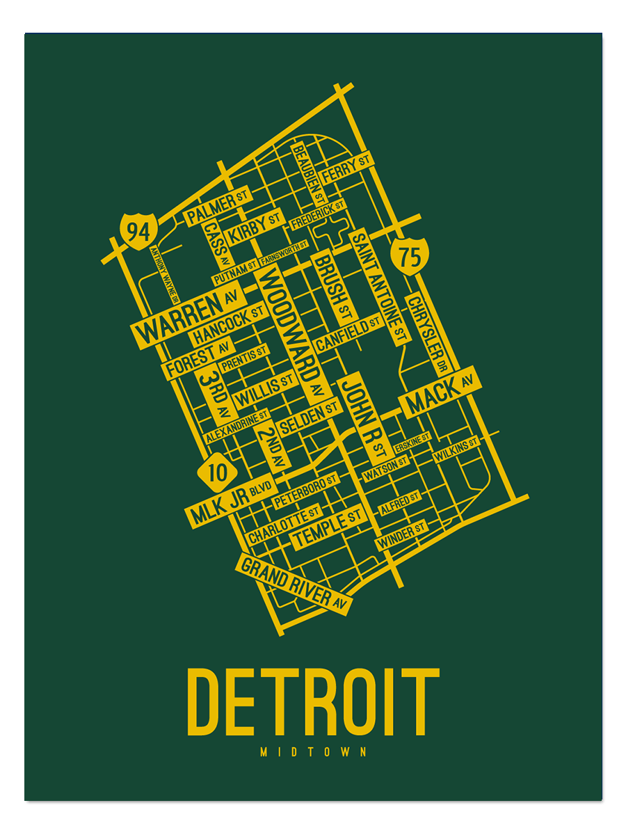 Our map of Detroit's midtown neighborhood features the streets and avenues around Woodward, Warren, Cass, and Kirby.