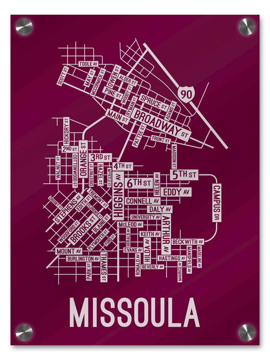 Printed on 1/4” thick cast acrylic and anchored to the wall with four stainless steel standoffs for secure and stylish wall hanging.
