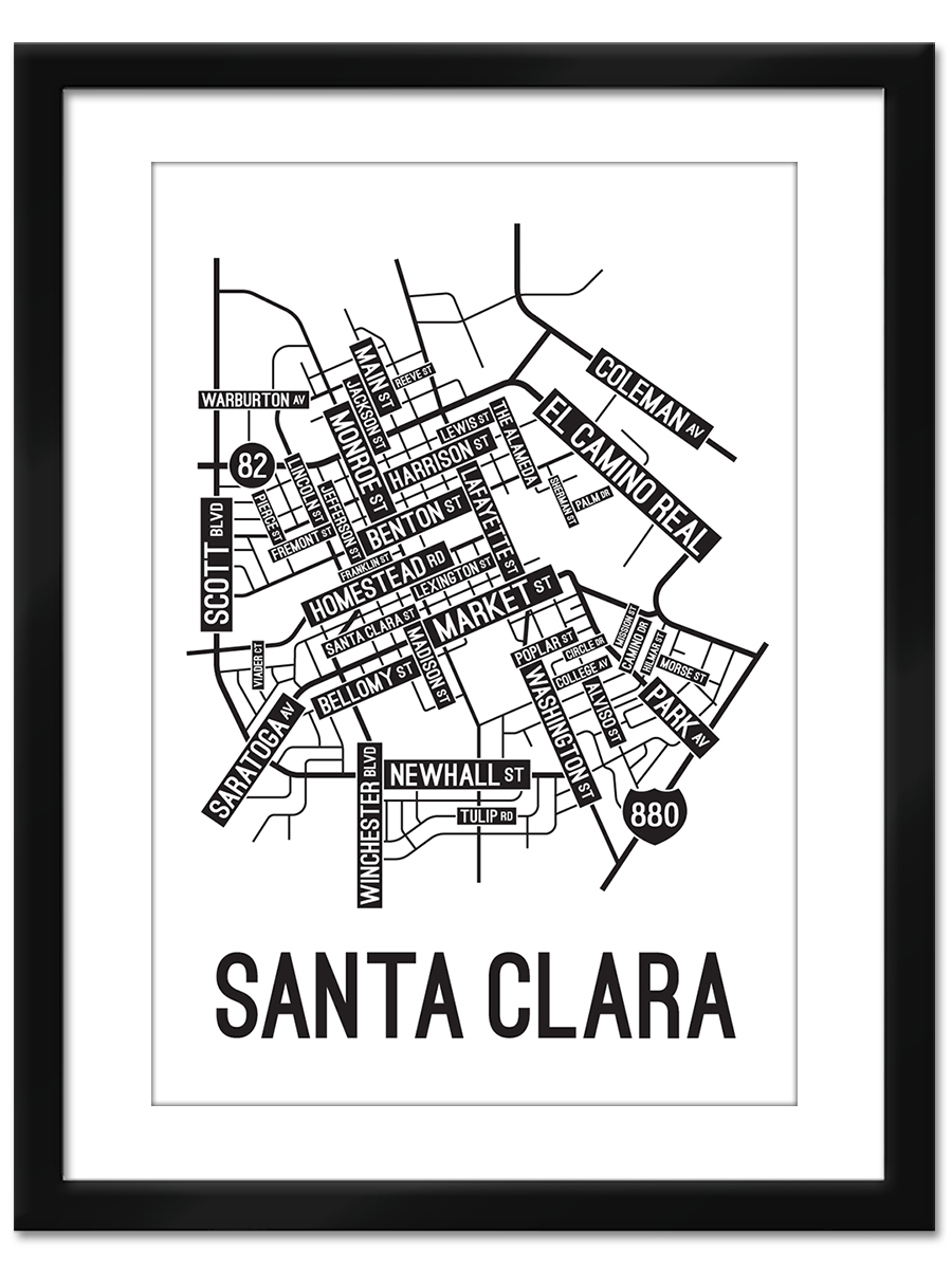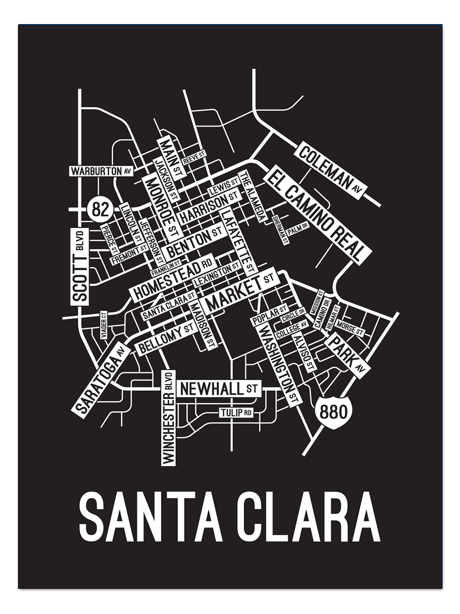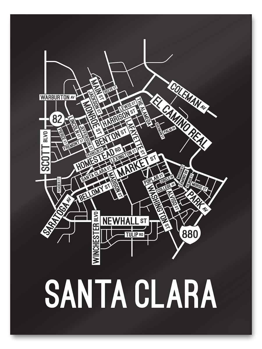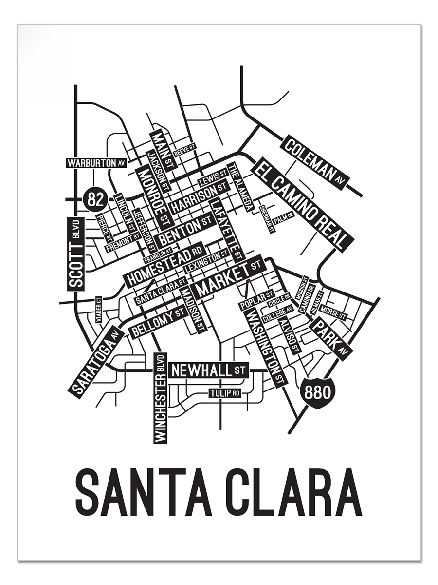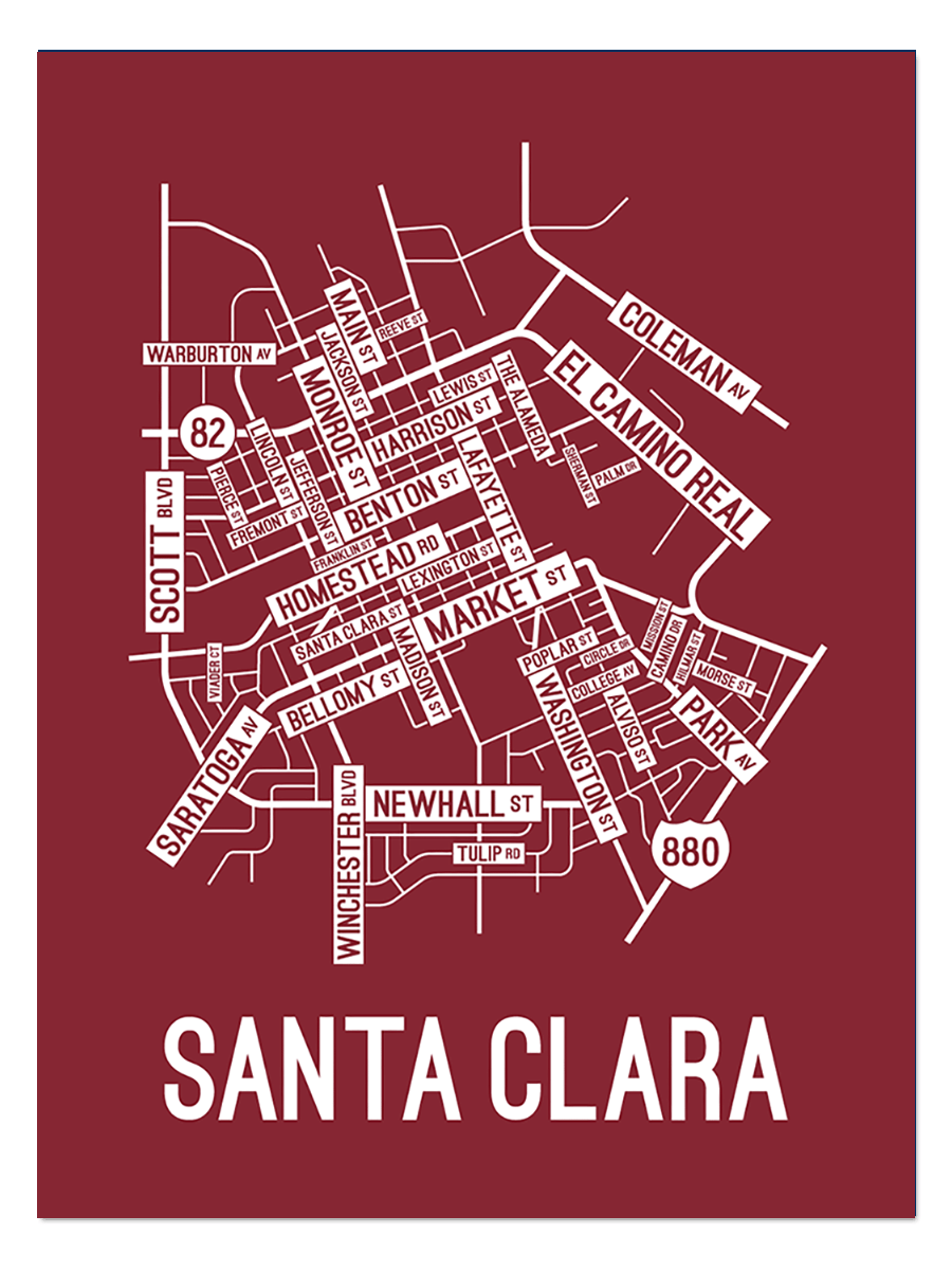 Our Santa Clara, California street map is a tribute to downtown and the streets around The Alameda, Lafayette, Homestead, and El Camino Real.